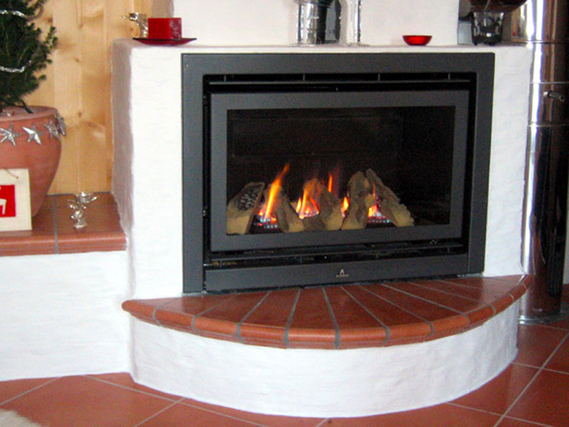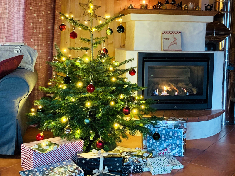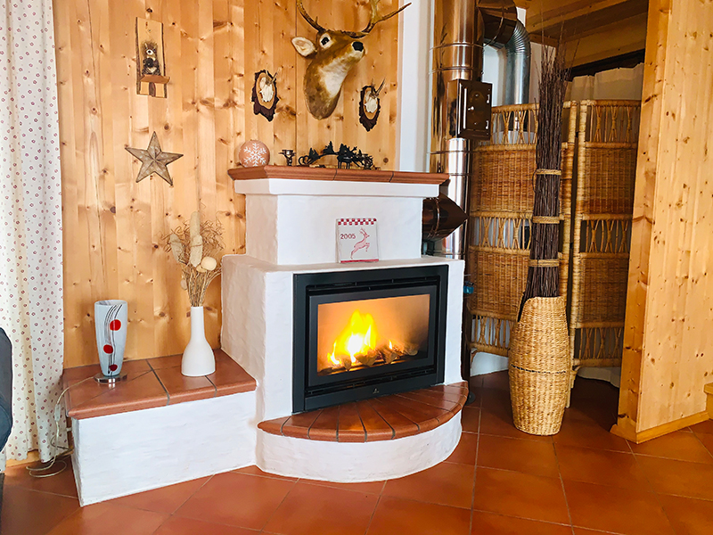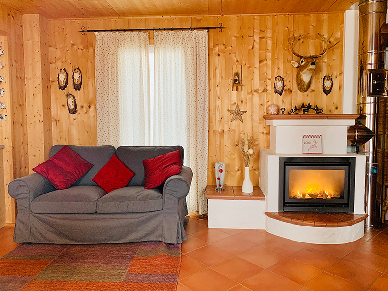 Wohn- und Esszimmer: Gemütlicher Kamin-Ofen, Sitzgelegenheit für 6 Personen, Sofa, Kinderhochstuhl vorhanden.